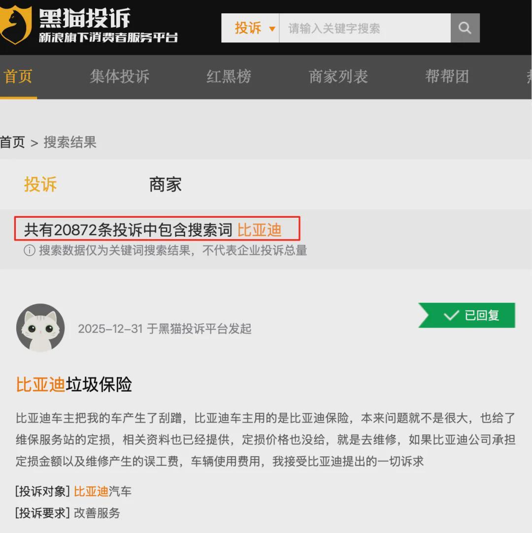 图/黑猫投诉平台关于比亚迪的投诉