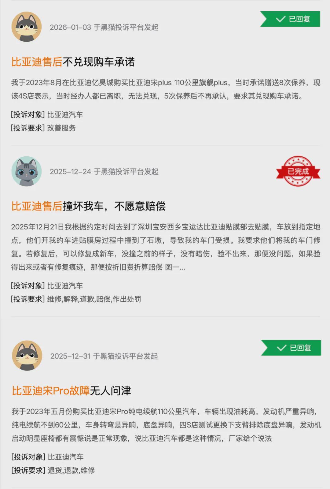 图/黑猫投诉平台关于比亚迪售后的问题